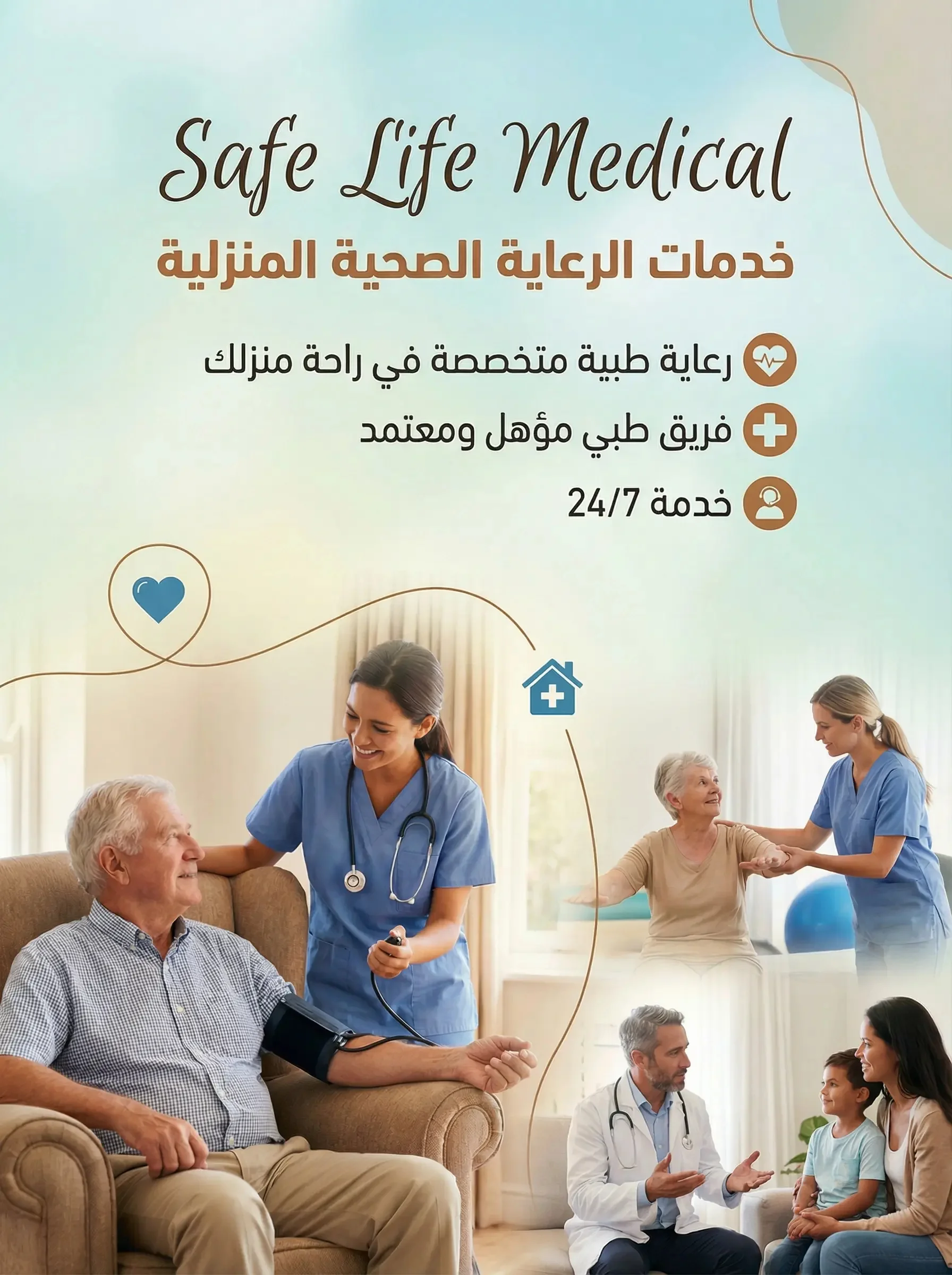 في Safelifemedicals نقدم لكِ خدمات رعاية طبية منزلية على مدار الساعة، يشرف عليها فريق من الأطباء والممرضين المتخصصين لضمان راحتك وسلامتك في كل لحظة.